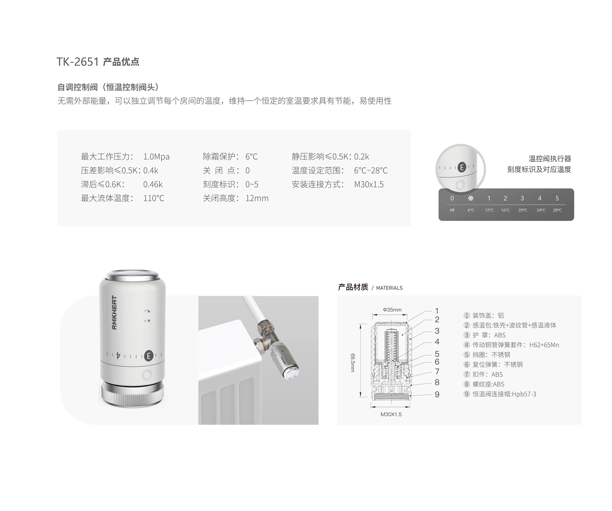 自调控制阀(恒温控制阀头)无需外部能量,可以独立调节每个房间的温度,维持一个恒定的室温要求具有节能,易使用性。
