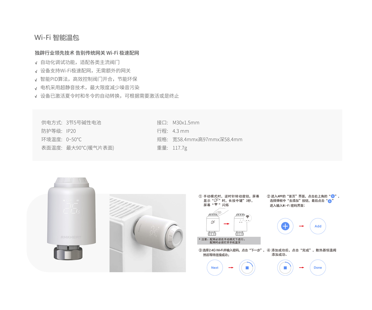 独辟行业领先技术 告别传统网关 Wi-Fi 极速配网 自动化调试功能,适配各类主流阀门 设备支持Wi-Fi极速配网,无需额外的网关 智能PID算法,高效控制阀门开合,节能环保 电机采用超静音技术,最大限度减少噪音污染 设备已激活夏令时和冬令的自动转换,可根据需要激活或是终止。
