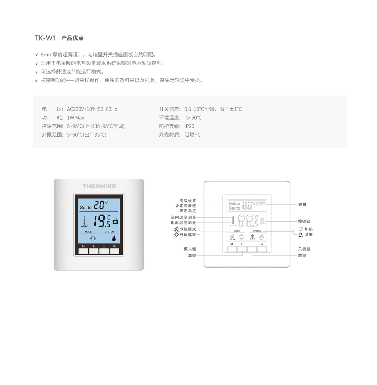 8mm厚度超薄设计,与墙壁开关插座面板自然匹配。适用于电采暖的电热设备或水系统采暖的电驱动阀控制。可选择舒适或节能运行模式。按键锁功能——避免误操作。单独的塑料袋以及内盒,避免运输途中受损。